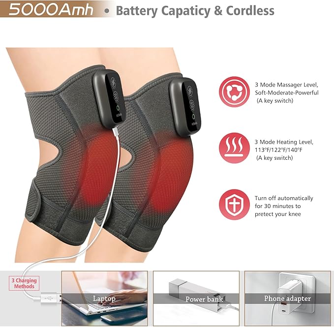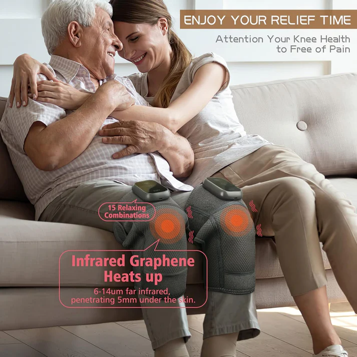 The Wireless Knee Massager is a multifunctional therapy device designed to relieve pain, stiffness, and fatigue